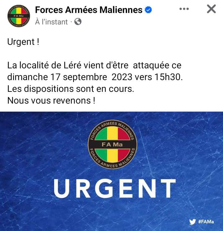 CICAM, the information and communication unit for military affairs, has published urgent Flash No. 005. It indicates that following a vigorous attack by the Azawad national army against a Malian army barracks in Léré took place this Sunday, September 17, 2023 at 3:30 p.m. He also claims to have taken total control after two hours of combat.