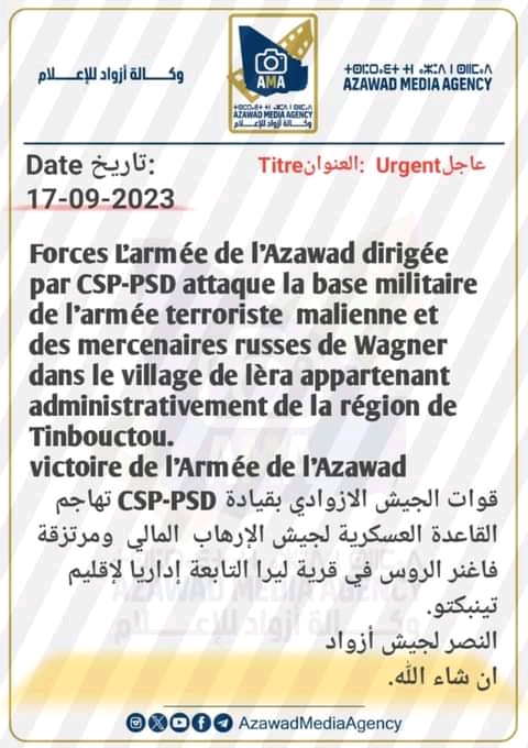 نشرت وحدة المعلومات والاتصالات للشؤون العسكرية CICAM، الأمر العاجل العاجل رقم 005. وتشير إلى أنه في أعقاب الهجوم العنيف الذي شنه الجيش الوطني الأزوادى على ثكنة للجيش المالي في ليري، وقع يوم الأحد 17 سبتمبر 2023 الساعة 3:30 مساءً. كما يدعي أنه سيطر بشكل كامل بعد ساعتين من القتال.